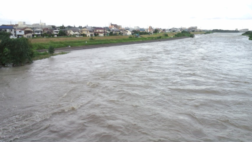 立日橋から上流側、中央線の鉄橋がわずかに見えますね、川幅が物凄く広くなって茶色い水がゴゥゴゥと音を出しながら流れてます。