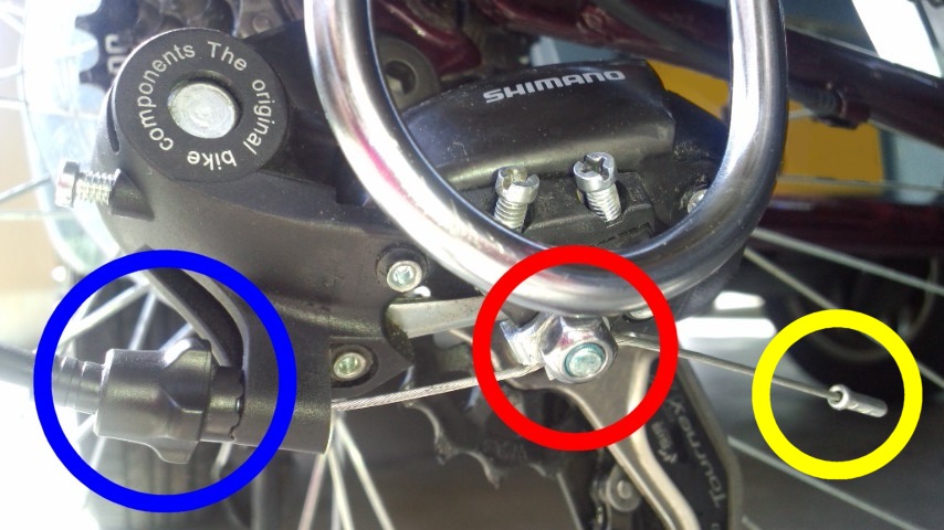 7.とりあえず変速してみる、ガチャガチャいって変わらない場合は青丸の調整ネジで調整する。