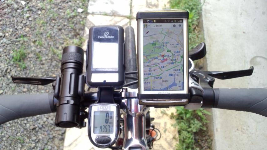 左からライト、GENTOS閃 SG-355B 、GPSロガーGP-101、サイコン、スマートフォン。