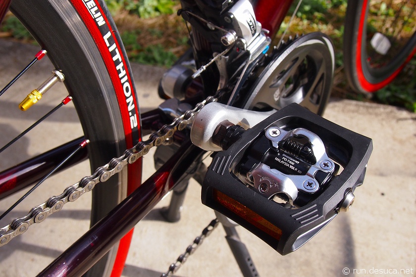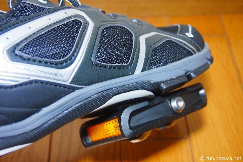 ペダルの幅は狭めですが、前後方向に余裕があるので普通のスニーカーでも踏むこと(乗ること)は出来ますし、ビンディングにトラブルがあっても踏むことも可能です。
